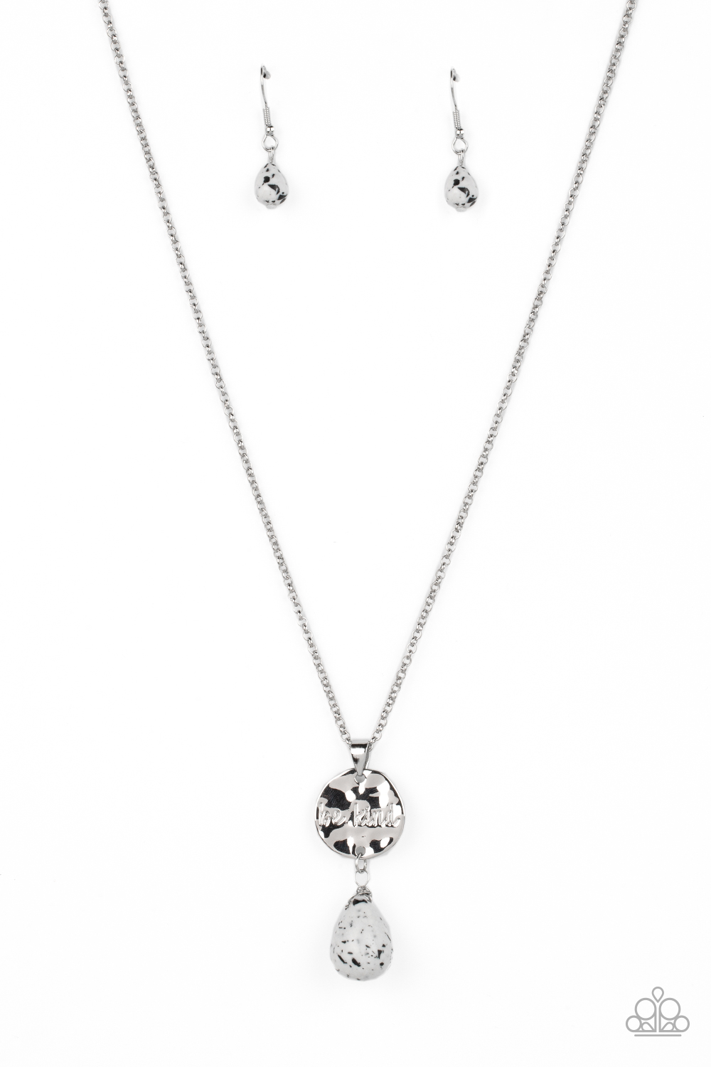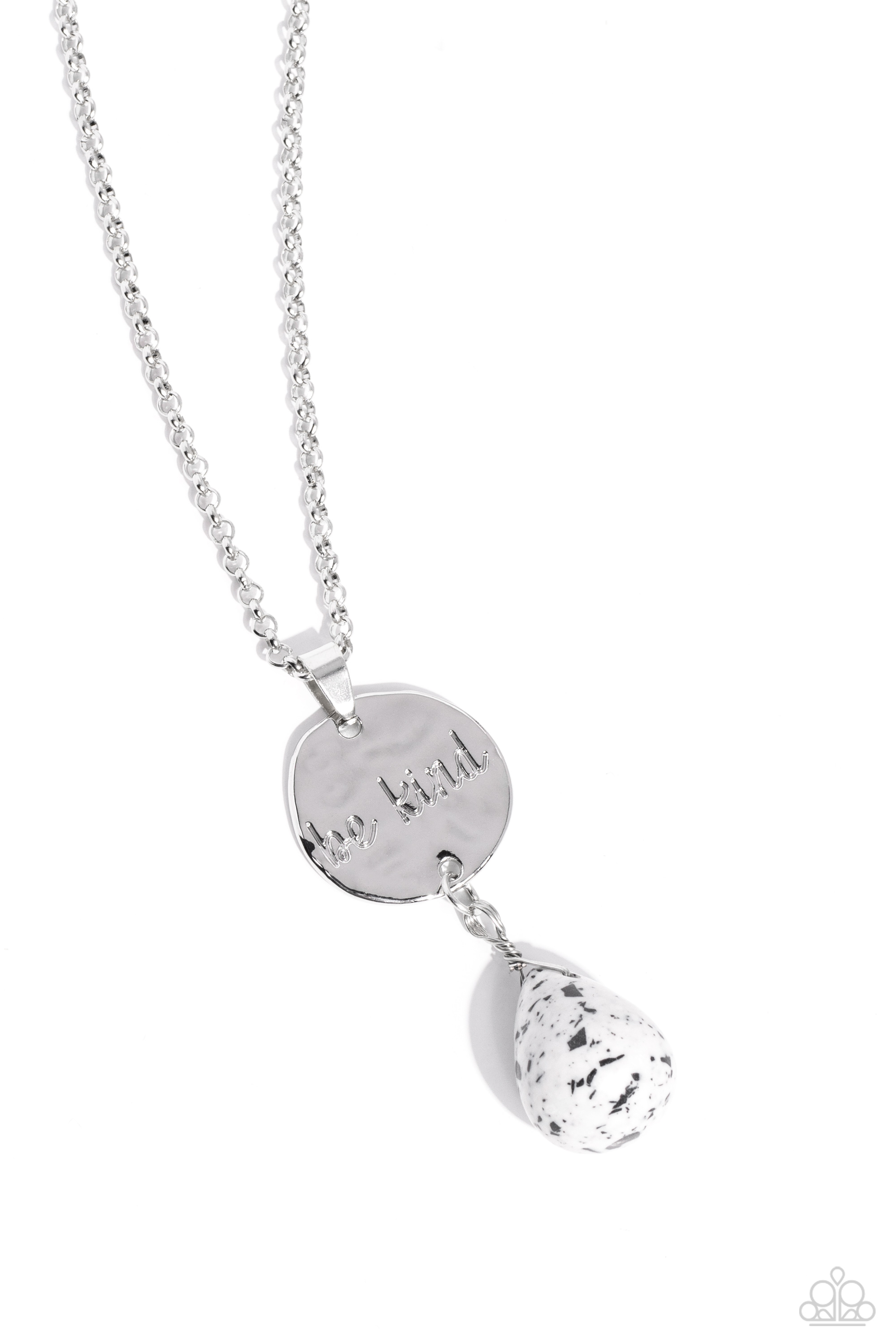 Swinging from a dainty silver chain, a hammered disc in the same hue is stamped with the words "be kind." A chiseled white speckled teardrop hangs from the bottom of the pendant adding a fashionably rustic feature. Features an adjustable clasp closure. As the stone elements in this piece are natural, some color variation is normal.