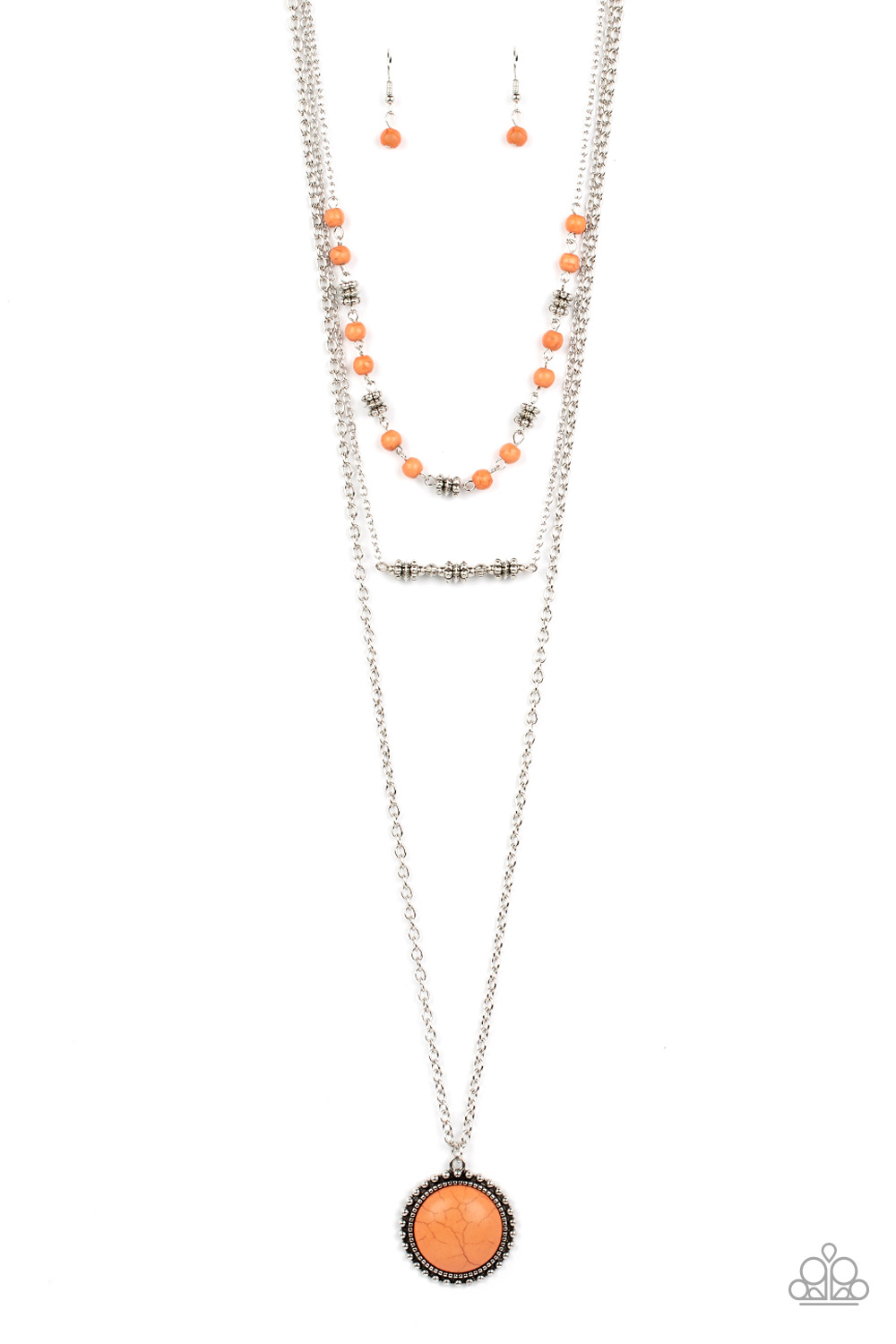 A round orange stone, set in a studded antiqued silver frame, creates a bold pendant at the bottom of a lengthened silver chain. This earthy statement piece is accompanied by layered strands of orange stone beads and antiqued silver accents that connect to dainty silver chains making a charming layered design. Features an adjustable clasp closure.